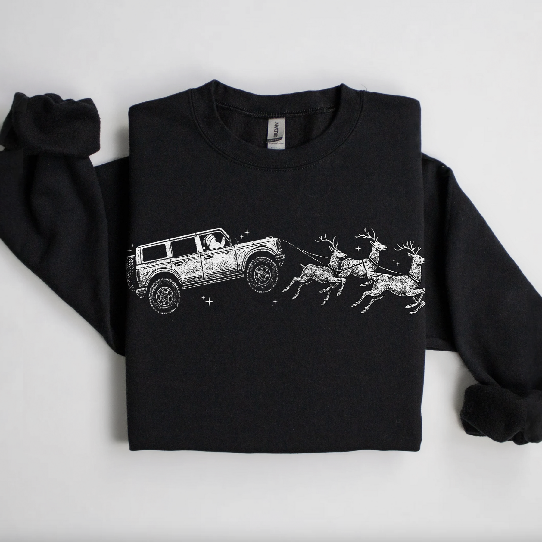 Santa’s Bronco Sleigh Crewneck Sweatshirt – Black Christmas sweatshirt with white Bronco and reindeer design, holiday apparel by Mud Digger Design Co.